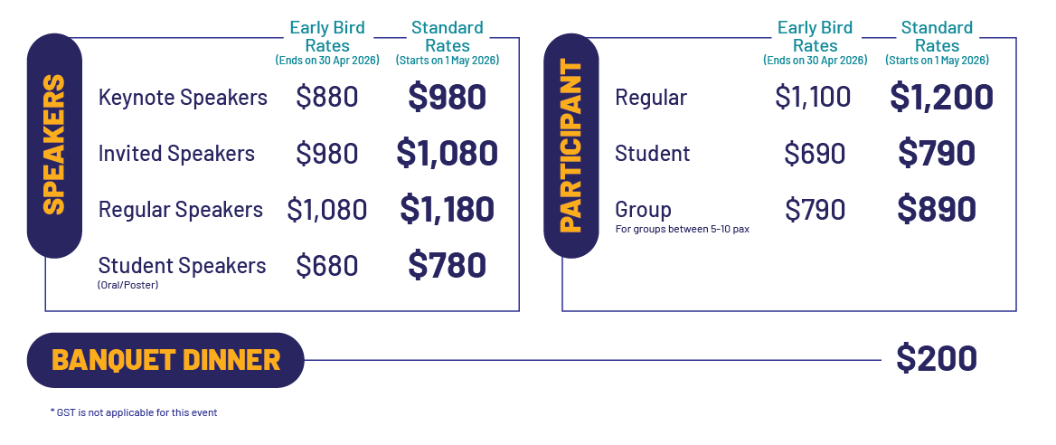 *Applicable for groups of 5 and more. Please click here group registration.*All prices stated above are in SGD.